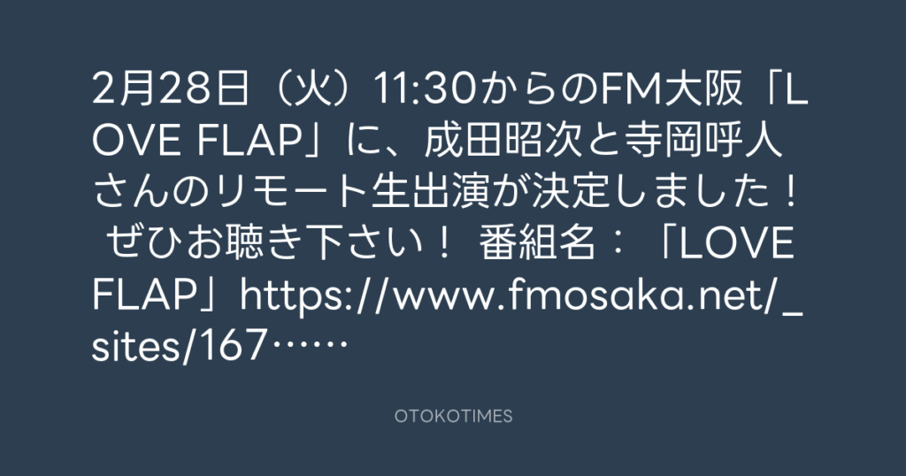 2月28日(火)11:30からのFM大阪「LOVE FLAP」に、成田昭次と寺岡呼人さんのリモー... -