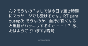Koyo Maeda @koyomaeda – 7:18・2011年7月15日 2011 7/15 前田耕陽 2011-07-15 ん?そうなの?よしでは今日は空き時間にマッサージでも受けるかな。RT @mousep3: そうなのか、血行が良くなると黒目がハッキリするのか……!? あ、おはようございます。▷森崎 Source:https://x.com/koyomaeda/status/91632797193740289 text X Post 前田耕陽 前田耕陽 この記事が気に入ったら フォローしてね! Follow @OtokoTimes1988 よかったらシェアしてね! URLをコピーしました! Koyo Maeda @koyomaeda - 6:17・2011年7月15日 Koyo Maeda @koyomaeda - 8:21・2011年7月15日 関連記事 Artist 前田耕陽 1968.08.16