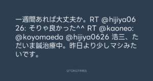 一週間あれば大丈夫か。RT @hijiya0626: そりゃ良かった^^ RT @kaoneo: @koyomaeda @hijiya0626 浩三、ただいま鍼治療中。昨日より少しマシみたいです。
