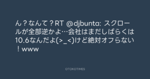 ん?なんて?RT @djbunta: スクロールが全部逆かよ…会社はまだしばらくは10.6なんだよ(>_<)けど絶対オフらない!www
