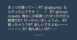 まっつが買って〜!RT @djbunta: なんだったんですか(・・) RT @koyomaeda: 俺はこの前買ったばっかだから無理だRT 行っちゃいましょうよ。 RT 買っちゃう?RT 欲しいですよね〜〜〜〜〜〜〜 RT 俺も欲しいRT 光る MacBook Air