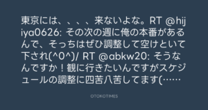 東京には、、、、来ないよな。RT @hijiya0626: その次の週に俺の本番があるんで、そっちはぜひ調整して空けといて下され(^0^)/ RT @abkw20: そうなんですか!観に行きたいんですがスケジュールの調整に四苦八苦してます(>_<)