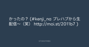 Koyo Maeda @koyomaeda – 22:35・2011年7月22日 2011 7/22 前田耕陽 2011-07-22 かったの? (#kenji_na プレハブから生配信~(笑) http://moi.st/2011b7 ) Source:https://x.com/koyomaeda/status/94400067624124416 text X Post 前田耕陽 前田耕陽 この記事が気に入ったら フォローしてね! Follow @OtokoTimes1988 よかったらシェアしてね! URLをコピーしました! Koyo Maeda @koyomaeda - 22:34・2011年7月22日 Koyo Maeda @koyomaeda - 22:35・2011年7月22日 関連記事 Artist 前田耕陽 1968.08.16