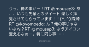 うっ、俺の事かー!RT @mousep3: あ、、いつも先輩とのツイート 楽しく拝見させてもらっています!!(^。^)▷森崎RT @koyomaeda: ん?俺の事じゃないよね?RT @mousep3: ようアイコン変えるなぁー。特に同じ事務所のお二人。▷森崎