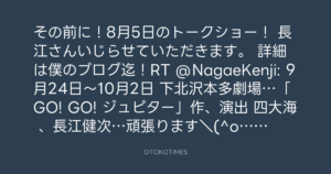 詳細は僕のブログ迄!RT @NagaeKenji: 9月24日~10月2日 下北沢本多劇場…「GO! GO! ジュピター」作、演出 四大海 、長江健次…頑張ります\(^o^)/
