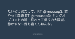 Koyo Maeda @koyomaeda – 7:07・2011年7月29日 2011 7/29 前田耕陽 2011-07-29 たいぞう君だって。RT @mousep3: 誰やっ!▷森崎 RT @mousep3: キングオブコントの稽古終わって帰りの大阪城、静かやな〜蝉も寝てんねんな。 Source:https://x.com/koyomaeda/status/96703447180644352 text X Post 前田耕陽 前田耕陽 この記事が気に入ったら フォローしてね! Follow @OtokoTimes1988 よかったらシェアしてね! URLをコピーしました! Koyo Maeda @koyomaeda - 7:06・2011年7月29日 Koyo Maeda @koyomaeda - 7:12・2011年7月29日 関連記事 Artist 前田耕陽 1968.08.16