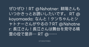 ぜひぜひ!RT @Nshatner: 耕陽さんもいつかきっとお誘いしたいです。 RT @koyomaeda: なんと!ケンちゃんとシャトナーさんがやるの?RT @Nshatner: 長江さん!長江さんは舞台を見守る精霊の役で是非… RT @NagaeKenji: 長江はどの役で