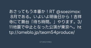 Koyo Maeda @koyomaeda – 8:54・2011年8月1日 2011 8/01 前田耕陽 2011-08-01 あさってもう本番か!RT @soezimax: 8月である。いよいよ明後日から!吉祥寺にて舞台「待ち時間。」やります。3/11地震で中止となった公演が東京へ。http://ameblo.jp/team54produce/ Source:https://x.com/koyomaeda/status/97817317605507072 text X Post 前田耕陽 前田耕陽 この記事が気に入ったら フォローしてね! Follow @OtokoTimes1988 よかったらシェアしてね! URLをコピーしました! Koyo Maeda @koyomaeda - 8:09・2011年8月1日 Koyo Maeda @koyomaeda - 12:27・2011年8月1日 関連記事 Artist 前田耕陽 1968.08.16