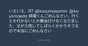 いえいえ、RT @kazumasamin: @koyomaeda 耕陽くんごめんなさい、行くとか行かないとか舞台行けなくなりました、父が入院してしばらくかかりそうなので本当にごめんなさい