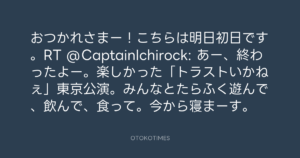 おつかれさまー!こちらは明日初日です。RT @CaptainIchirock: あー、終わったよー。楽しかった「トラストいかねぇ」東京公演。みんなとたらふく遊んで、飲んで、食って。今から寝まーす。