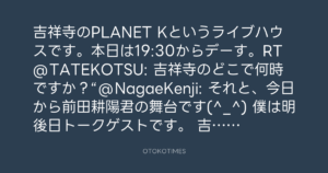 吉祥寺のPLANET Kというライブハウスです。本日は19:30からデーす。RT @TATEKOTSU: 吉祥寺のどこで何時ですか?“@NagaeKenji: それと、今日から前田耕陽君の舞台です(^_^) 僕は明後日トークゲストです。 吉祥寺です。o(^▽^)o”