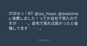 Koyo Maeda @koyomaeda – 12:08・2011年8月4日 2011 8/04 前田耕陽 2011-08-04 がははっ!RT @ya_haya: @soezimax 投票しました!ってか会社で見たのですが・・・。自宅で見れば良かったと後悔してます・・・。 Source:https://x.com/koyomaeda/status/98953347922542594 text X Post 前田耕陽 前田耕陽 この記事が気に入ったら フォローしてね! Follow @OtokoTimes1988 よかったらシェアしてね! URLをコピーしました! Koyo Maeda @koyomaeda - 12:07・2011年8月4日 Koyo Maeda @koyomaeda - 12:35・2011年8月4日 関連記事 Artist 前田耕陽 1968.08.16