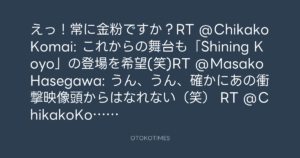 えっ!常に金粉ですか?RT @ChikakoKomai: これからの舞台も「Shining Koyo」の登場を希望(笑)RT @MasakoHasegawa: うん、うん、確かにあの衝撃映像頭からはなれない(笑) RT @ChikakoKomai: 前田耕陽くんの舞台、