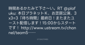 時間あるかたみて下さ〜い。RT @plafuku: 本日プラネットK、お芝居公演、3×3=3「待ち時間」最終日!またまたユースト配信します!15:00からスタートです! http://www.ustream.tv/channel/team54-3×3-3