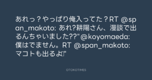 Koyo Maeda @koyomaeda – 17:03・2011年8月9日 2011 8/09 前田耕陽 2011-08-09 あれっ?やっぱり俺入ってた?RT @span_makoto: あれ?耕陽さん、漫談で出るんちゃいました??”@koyomaeda: 僕はでません。RT @span_makoto: マコトも出るよ♪” Source:https://x.com/koyomaeda/status/100839648342974464 text X Post 前田耕陽 前田耕陽 この記事が気に入ったら フォローしてね! Follow @OtokoTimes1988 よかったらシェアしてね! URLをコピーしました! Koyo Maeda @koyomaeda - 16:52・2011年8月9日 Koyo Maeda @koyomaeda - 17:08・2011年8月9日 関連記事 Artist 前田耕陽 1968.08.16