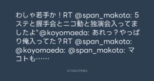 わしゃ若手か!RT @span_makoto: 5ステと握手会とニコ動と独演会入ってましたよ”@koyomaeda: あれっ?やっぱり俺入ってた?RT @span_makoto: @koyomaeda: @span_makoto: マコトも出るよ♪””