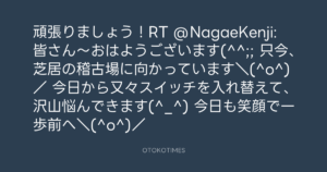 頑張りましょう!RT @NagaeKenji: 皆さん~おはようございます(^^;; 只今、芝居の稽古場に向かっています\(^o^)/ 今日から又々スイッチを入れ替えて、沢山悩んできます(^_^) 今日も笑顔で一歩前へ\(^o^)/