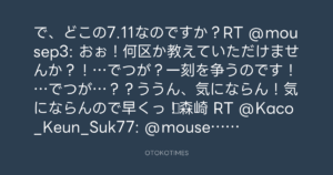 で、どこの7.11なのですか?RT @mousep3: おぉ!何区か教えていただけませんか?!…でつが?一刻を争うのです!…でつが…??ううん、気にならん!気にならんので早くっ!▷森崎 RT @Kaco_Keun_Suk77: @mousep3 梨味大量に近所の711にあります大