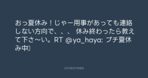 Koyo Maeda @koyomaeda – 0:07・2011年8月13日 2011 8/13 前田耕陽 2011-08-13 おっ夏休み!じゃー用事があっても連絡しない方向で、、、 休み終わったら教えて下さ〜い。RT @ya_haya: プチ夏休み中♪ Source:https://x.com/koyomaeda/status/102033484599656448 text X Post 前田耕陽 前田耕陽 この記事が気に入ったら フォローしてね! Follow @OtokoTimes1988 よかったらシェアしてね! URLをコピーしました! Koyo Maeda @koyomaeda - 16:00・2011年8月12日 Koyo Maeda @koyomaeda - 0:15・2011年8月13日 関連記事 Artist 前田耕陽 1968.08.16