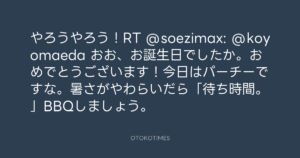 Koyo Maeda @koyomaeda – 12:21・2011年8月16日 2011 8/16 前田耕陽 2011-08-16 やろうやろう!RT @soezimax: @koyomaeda おお、お誕生日でしたか。おめでとうございます!今日はパーチーですな。暑さがやわらいだら「待ち時間。」BBQしましょう。 Source:https://x.com/koyomaeda/status/103305459301228544 text X Post 前田耕陽 前田耕陽 この記事が気に入ったら フォローしてね! Follow @OtokoTimes1988 よかったらシェアしてね! URLをコピーしました! Koyo Maeda @koyomaeda - 11:30・2011年8月16日 Koyo Maeda @koyomaeda - 12:22・2011年8月16日 関連記事 Artist 前田耕陽 1968.08.16