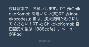 夜は宮本で、お願いします。RT @ChikakoKomai: 間違いない(笑)RT @inouekozodesu: 夜は、炭火焼肉たむらにしてください!RT @ChikakoKomai: 宮田麺児の後は「888cafe」。メニューがiPadで面白ーい^^*