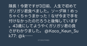 隊長!今更ですが3日前、人生で初めてガリガリ君食べました。ソーダ味!めっちゃくちゃうまかった!なぜ今まで手を付けなかったのだろうと後悔しています。43歳にしてようやくガリガリ君の良さがわかりました。