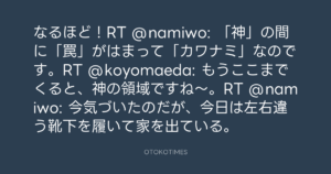 なるほど!RT @namiwo: 「神」の間に「罠」がはまって「カワナミ」なのです。RT @koyomaeda: もうここまでくると、神の領域ですね〜。RT @namiwo: 今気づいたのだが、今日は左右違う靴下を履いて家を出ている。