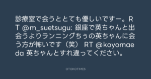 Koyo Maeda @koyomaeda – 17:02・2011年9月4日 2011 9/04 前田耕陽 2011-09-04 診療室で会うととても優しいですー。RT @m_suetsugu: 銀座で英ちゃんと出会うよりランニングちぅの英ちゃんに会う方が怖いです(笑) RT @koyomaeda 英ちゃんとすれ違ってください。 Source:https://x.com/koyomaeda/status/110261327485861888 text X Post 前田耕陽 前田耕陽 この記事が気に入ったら フォローしてね! Follow @OtokoTimes1988 よかったらシェアしてね! URLをコピーしました! Koyo Maeda @koyomaeda - 16:31・2011年9月4日 Koyo Maeda @koyomaeda - 22:58・2011年9月4日 関連記事 Artist 前田耕陽 1968.08.16