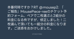 本番何時ですか?RT @mousep2: 「ご報告」MousePiece-reeのチケット予約フォーム、ペアで二枚選ぶと2組分の料金になる件ですが、修正しました!二枚選んで頂いても一組分の料金になります。ご迷惑をおかけしました。