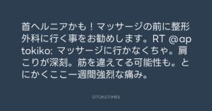 首ヘルニアかも!マッサージの前に整形外科に行く事をお勧めします。RT @aptokiko: マッサージに行かなくちゃ。肩こりが深刻。筋を違えてる可能性も。とにかくここ一週間強烈な痛み。