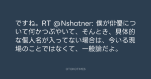 Koyo Maeda @koyomaeda – 23:48・2011年9月7日 2011 9/07 前田耕陽 2011-09-07 ですね。RT @Nshatner: 僕が俳優について何かつぶやいて、そんとき、具体的な個人名が入ってない場合は、今いる現場のことではなくて、一般論だよ。 Source:https://x.com/koyomaeda/status/111450888186494976 text X Post 前田耕陽 前田耕陽 この記事が気に入ったら フォローしてね! Follow @OtokoTimes1988 よかったらシェアしてね! URLをコピーしました! Koyo Maeda @koyomaeda - 23:43・2011年9月7日 Koyo Maeda @koyomaeda - 8:12・2011年9月8日 関連記事 Artist 前田耕陽 1968.08.16