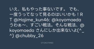 でも、一度うってなって見るのはいいかも!RT @Hajime_kun46: @koyomaeda うわぁ~、すごい戦法。そんな戦法、@koyomaeda さんにしか出来ないよ(^_^) @chubby_26