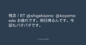 Koyo Maeda @koyomaeda – 16:29・2011年9月16日 2011 9/16 前田耕陽 2011-09-16 残念!RT @shigekisano: @koyomaeda お疲れです。明日帰るんです。今回もバタバタです。 Source:https://x.com/koyomaeda/status/114601866708525056 text X Post 前田耕陽 前田耕陽 この記事が気に入ったら フォローしてね! Follow @OtokoTimes1988 よかったらシェアしてね! URLをコピーしました! 青山英樹 @aoyama_hideki - 15:03・2011年9月16日 寺岡呼人 @yohito_teraoka - 18:01・2011年9月16日 関連記事 Artist 前田耕陽 1968.08.16