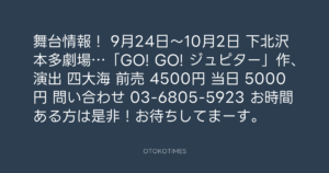 Koyo Maeda @koyomaeda – 19:39・2011年9月16日 2011 9/16 前田耕陽 2011-09-16 舞台情報! 9月24日~10月2日 下北沢本多劇場…「GO! GO! ジュピター」作、演出 四大海 前売 4500円 当日 5000円 問い合わせ 03-6805-5923 お時間ある方は是非!お待ちしてまーす。 Source:https://x.com/koyomaeda/status/114649545798975490 text X Post 前田耕陽 前田耕陽 この記事が気に入ったら フォローしてね! Follow @OtokoTimes1988 よかったらシェアしてね! URLをコピーしました! Koyo Maeda @koyomaeda - 19:36・2011年9月16日 Koyo Maeda @koyomaeda - 19:40・2011年9月16日 関連記事 Artist 前田耕陽 1968.08.16