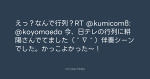 Koyo Maeda @koyomaeda – 21:45・2011年9月18日 2011 9/18 前田耕陽 2011-09-18 えっ?なんで行列?RT @kumicom8: @koyomaeda 今、日テレの行列に耕陽さんでてました(^∇^)伴奏シーンでした。かっこよかった〜! Source:https://x.com/koyomaeda/status/115406162937122816 text X Post 前田耕陽 前田耕陽 この記事が気に入ったら フォローしてね! Follow @OtokoTimes1988 よかったらシェアしてね! URLをコピーしました! Koyo Maeda @koyomaeda - 20:36・2011年9月18日 Koyo Maeda @koyomaeda - 11:08・2011年9月19日 関連記事 Artist 前田耕陽 1968.08.16