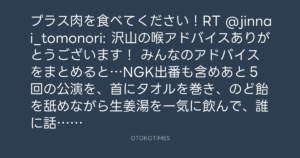 プラス肉を食べてください!RT @jinnai_tomonori: 沢山の喉アドバイスありがとうございます! みんなのアドバイスをまとめると…NGK出番も含めあと5回の公演を、首にタオルを巻き、のど飴を舐めながら生姜湯を一気に飲んで、誰に話しかけられても一言も喋らない…
