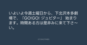 Koyo Maeda @koyomaeda – 12:26・2011年9月19日 2011 9/19 前田耕陽 2011-09-19 いよいよ今週土曜日から、下北沢本多劇場で、「GO!GO! ジュピター」 始まります。時間ある方は是非みに来て下さ〜い。 Source:https://x.com/koyomaeda/status/115627807408791552 text X Post 前田耕陽 前田耕陽 この記事が気に入ったら フォローしてね! Follow @OtokoTimes1988 よかったらシェアしてね! URLをコピーしました! Koyo Maeda @koyomaeda - 11:08・2011年9月19日 Koyo Maeda @koyomaeda - 12:50・2011年9月19日 関連記事 Artist 前田耕陽 1968.08.16