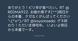 ありがとう!ピリ辛が食べたい。RT @RE0MA922: お疲れ様です(^^)明日からの本番、ケガなくがんばってください\(^o^)/RT @koyomaeda: ゲネ終わり!ただいま帰宅中。 いよいよ明日から本番で〜す。