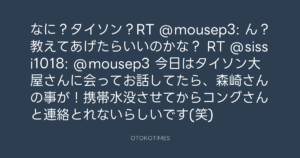 なに?タイソン?RT @mousep3: ん?教えてあげたらいいのかな? RT @sissi1018: @mousep3 今日はタイソン大屋さんに会ってお話してたら、森崎さんの事が!携帯水没させてからコングさんと連絡とれないらしいです(笑)