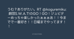 うむ?ありがたい。RT @koguremiku: 劇団S.W.A.T!のGO!GO!ジュピターめっちゃ楽しかったぁぁぁあ!!今までで一番好き!!日曜までやってます!!