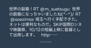 世界の副島!RT @m_suetsugu: 世界の副島になっちゃいましたね(^-^)/ RT @soezimax 埼玉へ行く手配できた。ネットは便利なものだ。SKIP国際Dシネマ映画祭、10/12の短編上映に監督として出席します。 http://www.skipcity-dcf.jp/fl_05.html#001