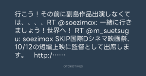 行こう!その前に副島作品出演しなくては、、、、RT @soezimax: 一緒に行きましょう!世界へ! RT @m_suetsugu: soezimax SKIP国際Dシネマ映画祭、10/12の短編上映に監督として出席します。 http://www.skipcity-dcf.jp/fl_05.html#001