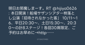 明日お邪魔しまーす。RT @hijiya0626: 本日開演!船場サザンシアター柿落とし公演「招待されなかった客」 10/11〜16、平日20:30〜、土日15:30〜、20:30〜の計8ステージ!各回30席限定、ご予約はお早めに→http://sembasazan.exblog.jp/