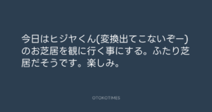 Koyo Maeda @koyomaeda – 17:11・2011年10月12日 2011 10/12 前田耕陽 2011-10-12 今日はヒジヤくん(変換出てこないぞー)のお芝居を観に行く事にする。ふたり芝居だそうです。楽しみ。 Source:https://x.com/koyomaeda/status/124034353121595393 text X Post 前田耕陽 前田耕陽 この記事が気に入ったら フォローしてね! Follow @OtokoTimes1988 よかったらシェアしてね! URLをコピーしました! 寺岡呼人 @yohito_teraoka - 17:01・2011年10月12日 寺岡呼人 @yohito_teraoka - 17:28・2011年10月12日 関連記事 Artist 前田耕陽 1968.08.16