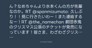 ん?なめちゃんより水本くんの方が先輩なのか。RT @spanmizumoto: 久しぶり!!見に行きたいわー!また連絡するなー!RT @the_namechan 劇団赤鬼のクリスマス公演のチケットが発売になっています!皆さま、わざわざクリスマスに、わざわざ赤鬼に会いに来てください