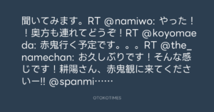 聞いてみます。RT @namiwo: やった!!奥方も連れてどうぞ!RT @koyomaeda: 赤鬼行く予定です。。。RT @the_namechan: お久しぶりです!そんな感じです!耕陽さん、赤鬼観に来てくださいー!! @spanmizumoto: お久しぶりです!いや、同