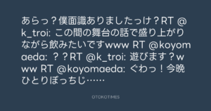 あらっ?僕面識ありましたっけ?RT @k_troi: この間の舞台の話で盛り上がりながら飲みたいですwww RT @koyomaeda: ??RT @k_troi: 遊びます?www RT @koyomaeda: ぐわっ!今晩ひとりぼっちじゃ。