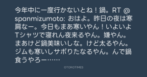 今年中に一度行かないとね!鍋。RT @spanmizumoto: おはよ。昨日の夜は寒肩なー。今日もまあ寒いやん!いよいよTシャツで寝れん夜来るやん。嫌やん。まあけど鍋美味いしな。けど太るやん。ジムも寒いしサボりたなるやん。んで鍋食うやろー。太るやん。結局冬は太るやん。 今日
