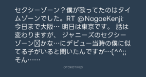 セクシーゾーン?僕が歌ってたのはタイムゾーンでした。RT @NagaeKenji: 今日まで大阪… 明日は東京です。 話は変わりますが、 ジャニーズのセクシーゾーン⁈かな…にデビュー当時の僕に似てる子がいると聞いたんですが…(^^;; そんな子いてるの⁇ ホンマに似てるの⁇