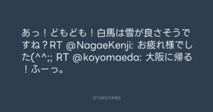 Koyo Maeda @koyomaeda – 16:47・2011年12月25日 2011 12/25 前田耕陽 2011-12-25 あっ!どもども!白馬は雪が良さそうですね?RT @NagaeKenji: お疲れ様でした(^^;; RT @koyomaeda: 大阪に帰る!ふーっ。 Source:https://x.com/koyomaeda/status/150845203073343488 text X Post 前田耕陽 前田耕陽 この記事が気に入ったら フォローしてね! Follow @OtokoTimes1988 よかったらシェアしてね! URLをコピーしました! Koyo Maeda @koyomaeda - 16:45・2011年12月25日 Koyo Maeda @koyomaeda - 17:00・2011年12月25日 関連記事 Artist 前田耕陽 1968.08.16